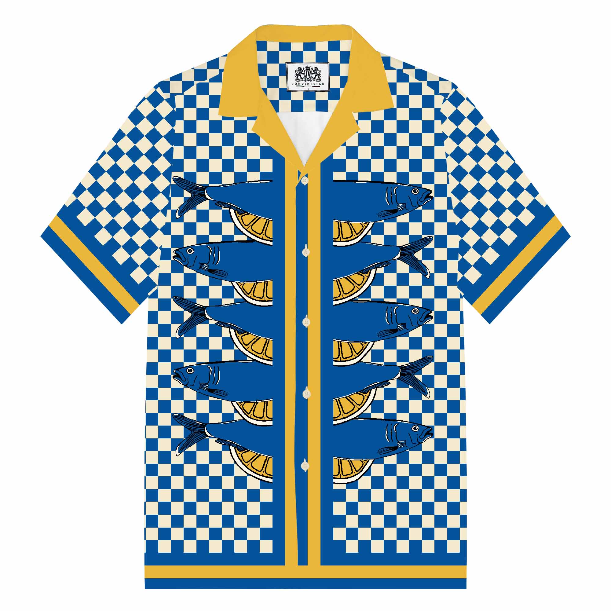 Sardine Pattern Blue And White Check Camp Collar Short Sleeve Shirt$43.99 USD$69.00 USD