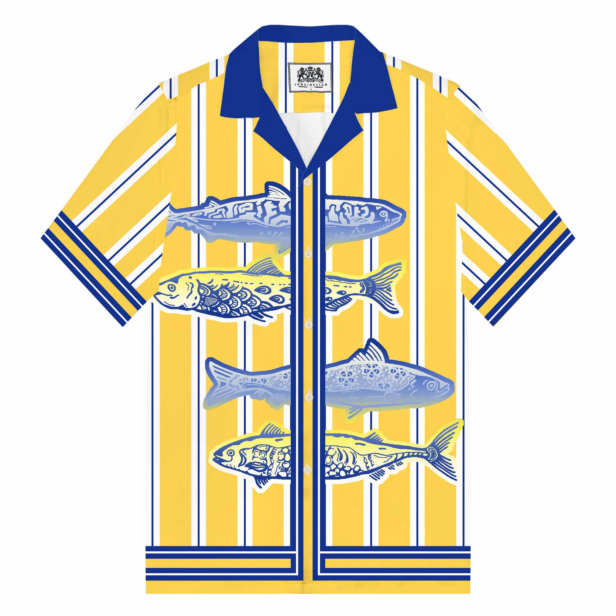 Yellow Striped Fish Print Camp Collar Short Sleeve Shirt$43.99 USD$69.00 USD