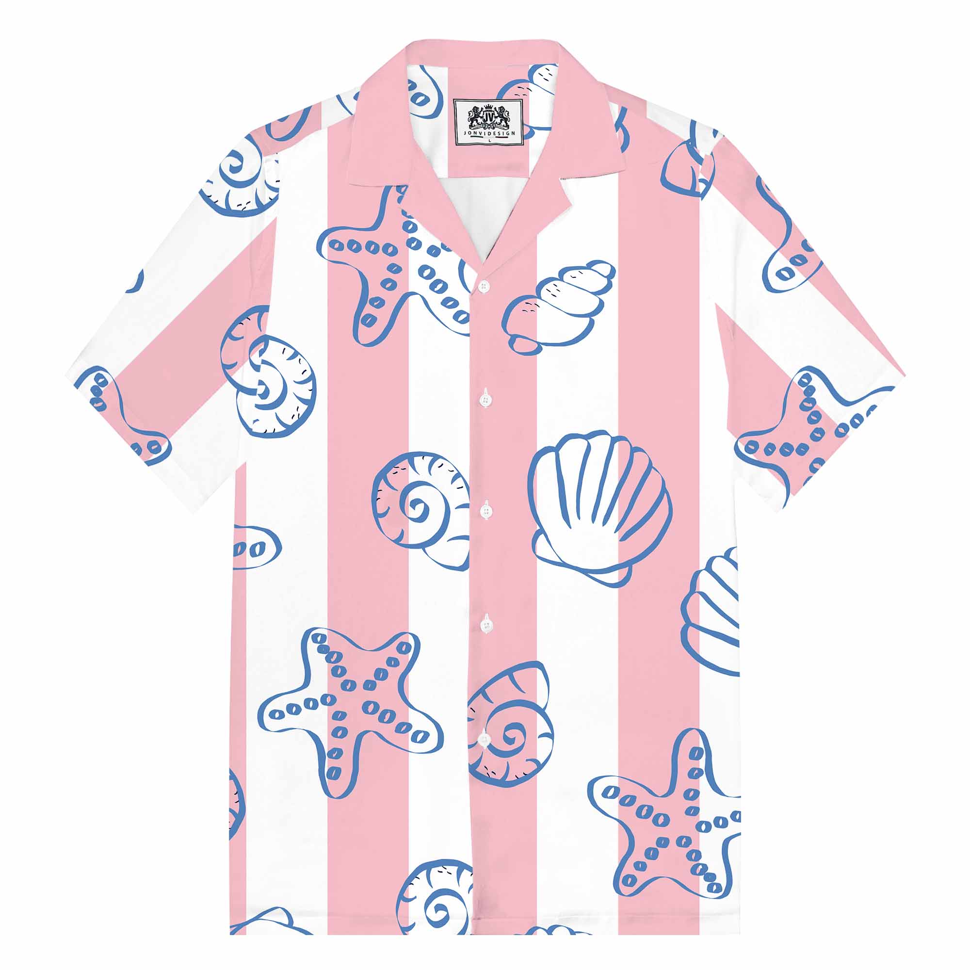 Pink And White Vertical Stripes Beach Shell Print Camp Collar Short Sleeve Shirt$43.99 USD$69.00 USD