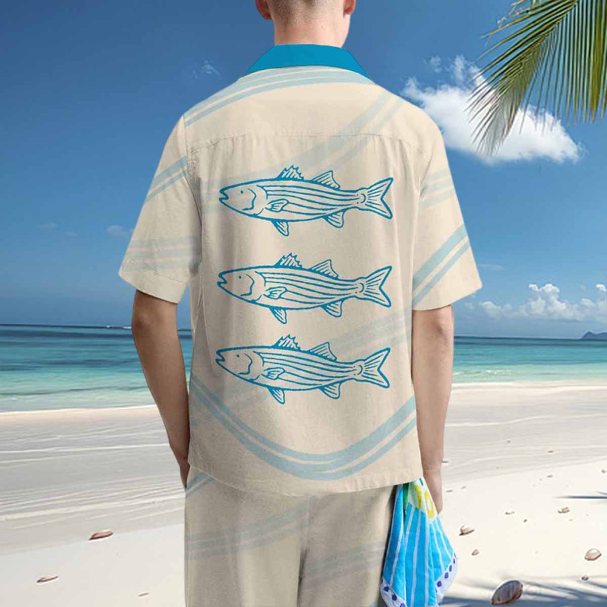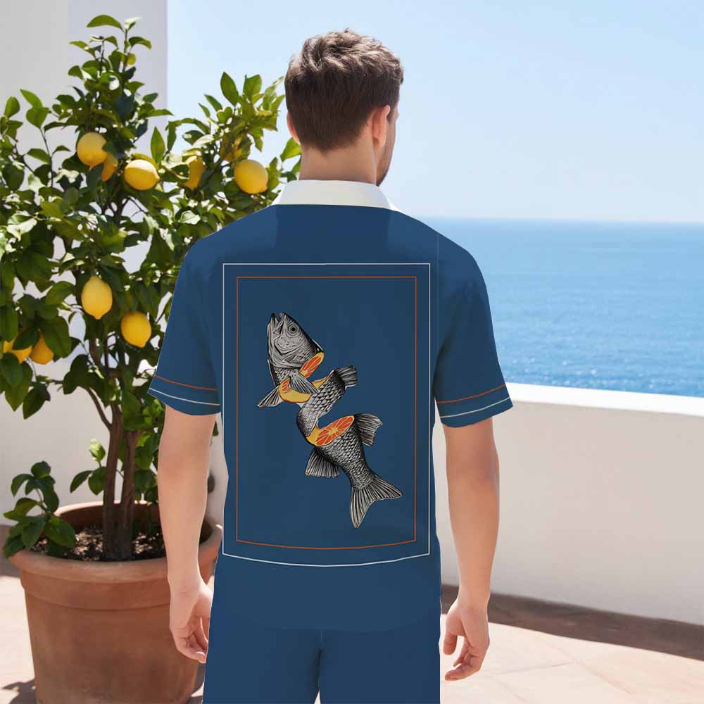 Striped Fish Print Blue Camp Collar Casual Short Sleeve Shirt$43.99 USD$69.00 USD