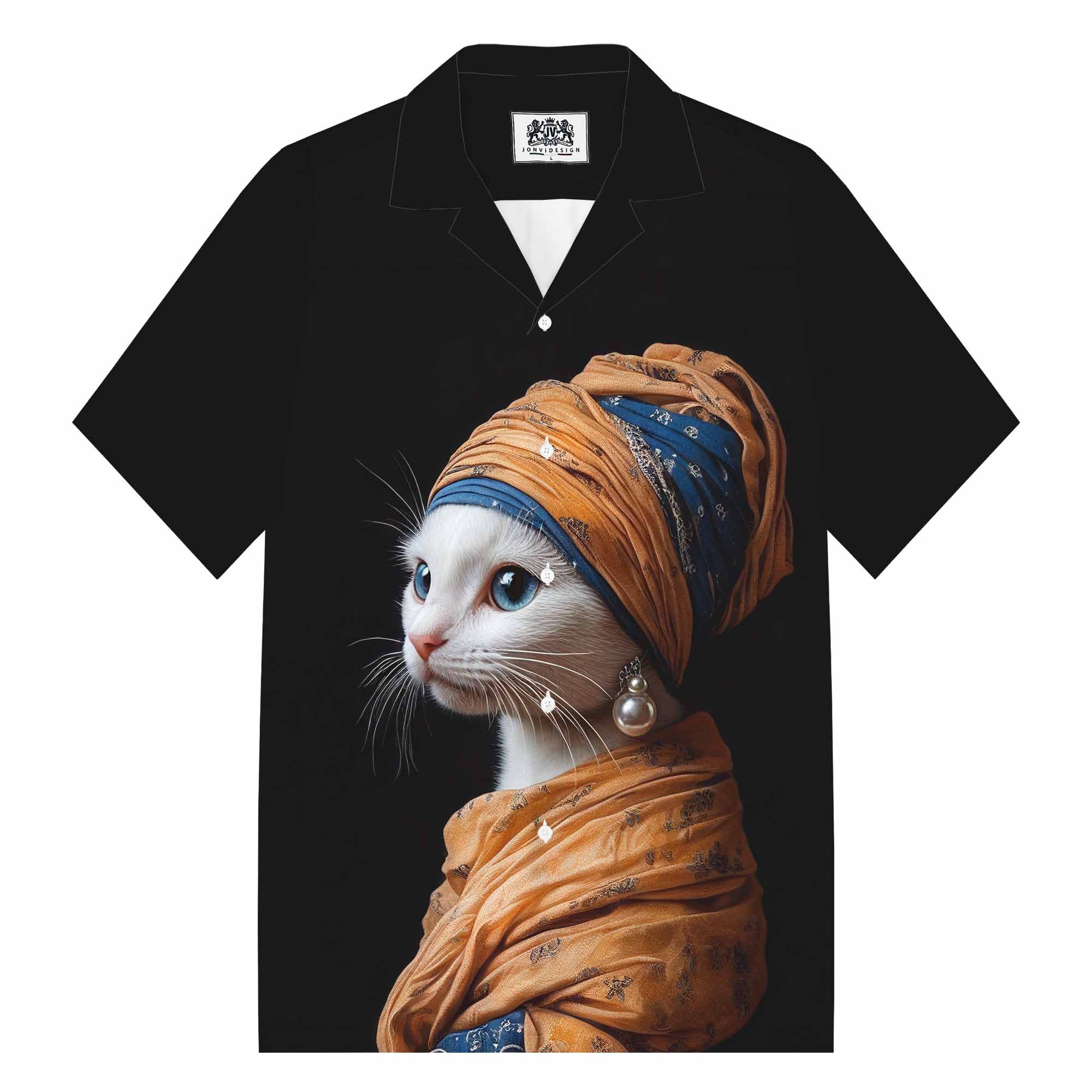 Funny Cat Girl With Pearl Earring Print Camp Collar Short-Sleeved Shirt$43.99 USD$69.00 USD