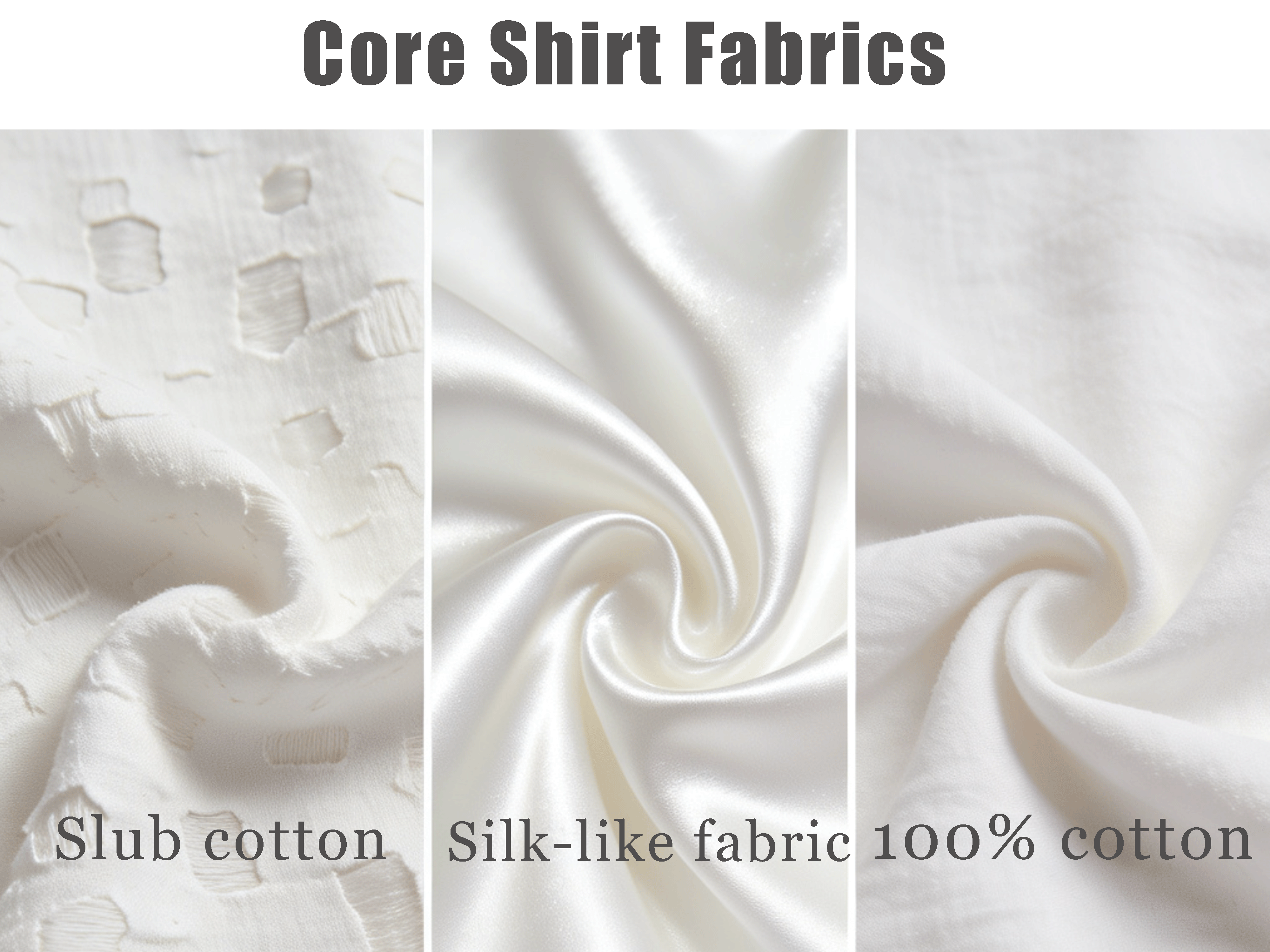 Our core fabrics—cotton, slub cotton, and silk-like materials—deliver comfort, texture, and versatile styling for men’s shirts.