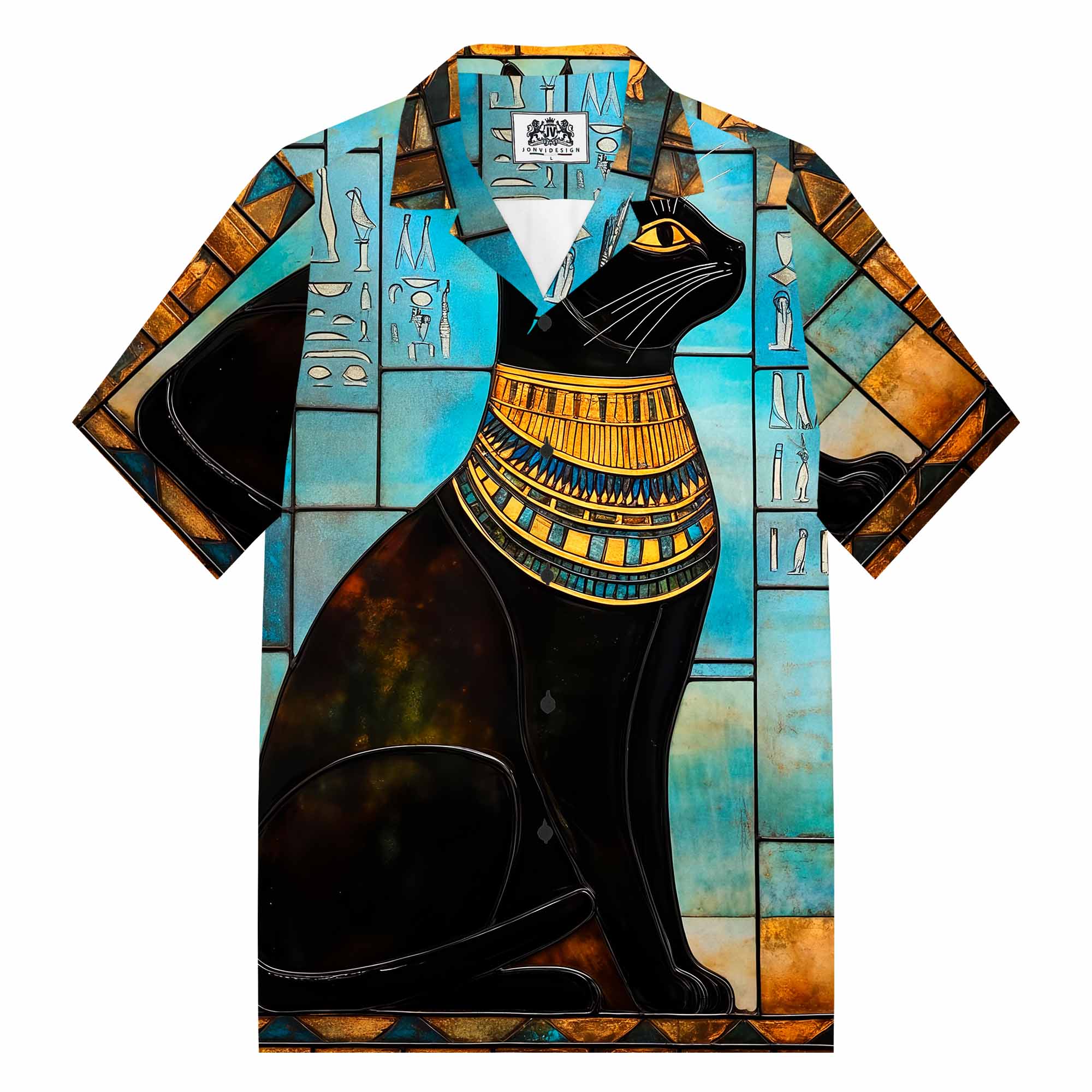 Ancient Egyptian Divine Black Cat Pattern Camp Collar Casual Short Sleeve Shirt