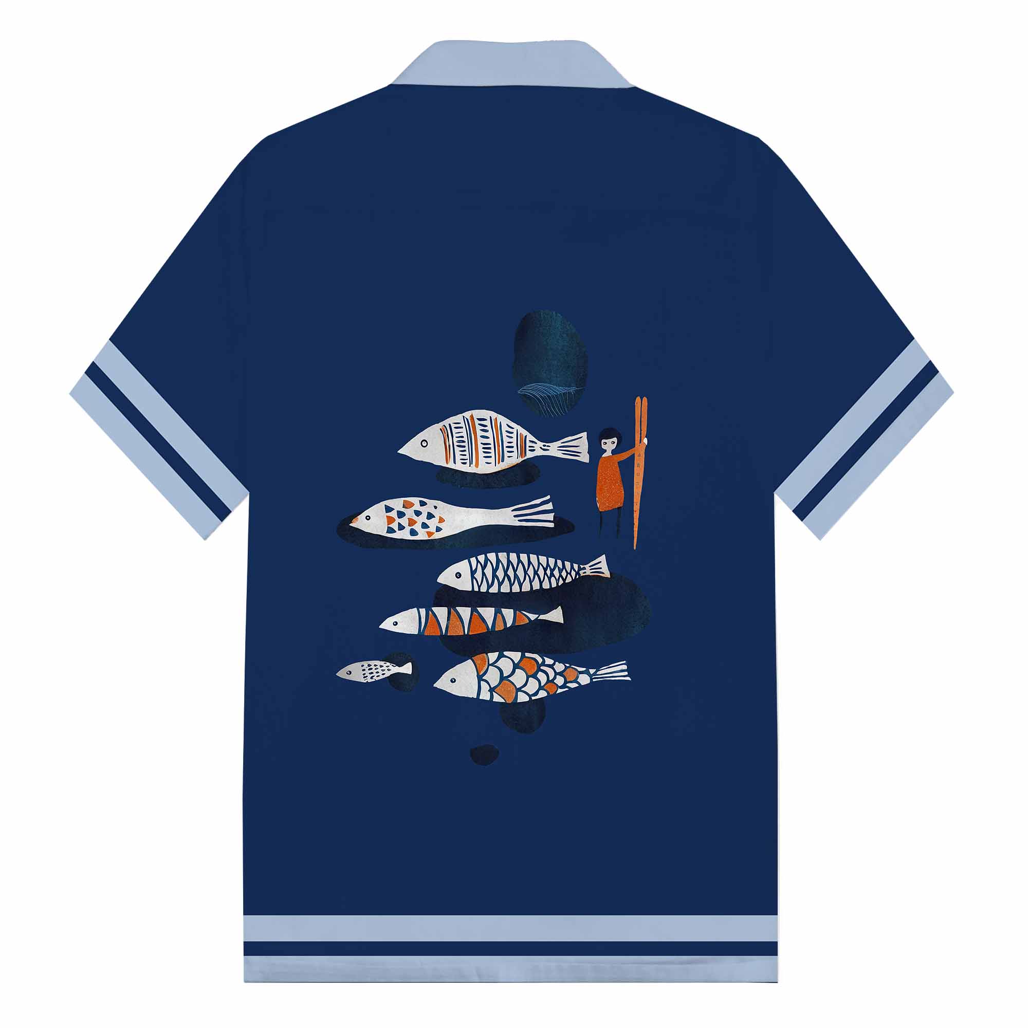 Dark Blue Fun Fish Print Camp Collar Short Sleeve Shirt