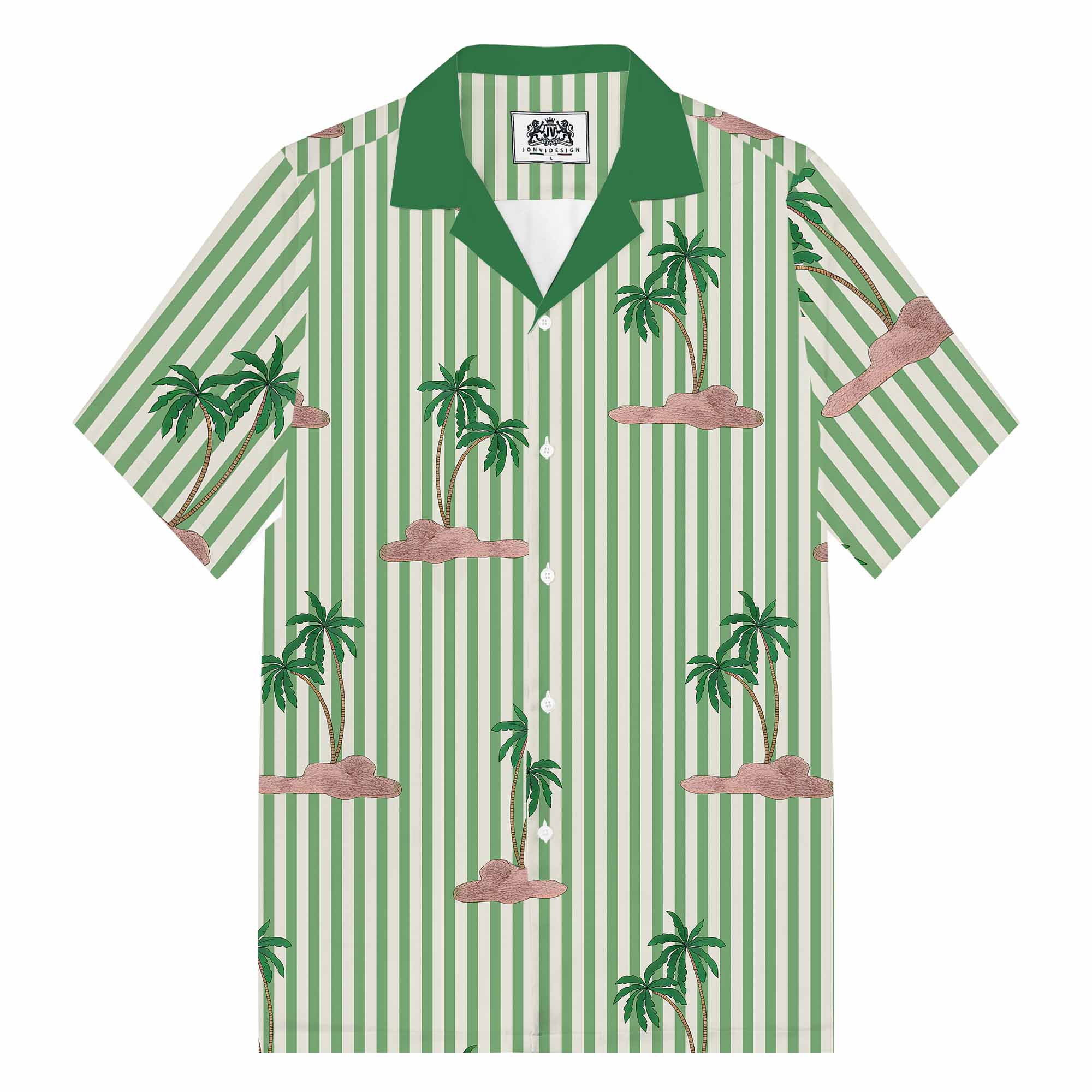 Green Striped Coconut Tree Pattern Camp Collar Short-Sleeved Shirt
