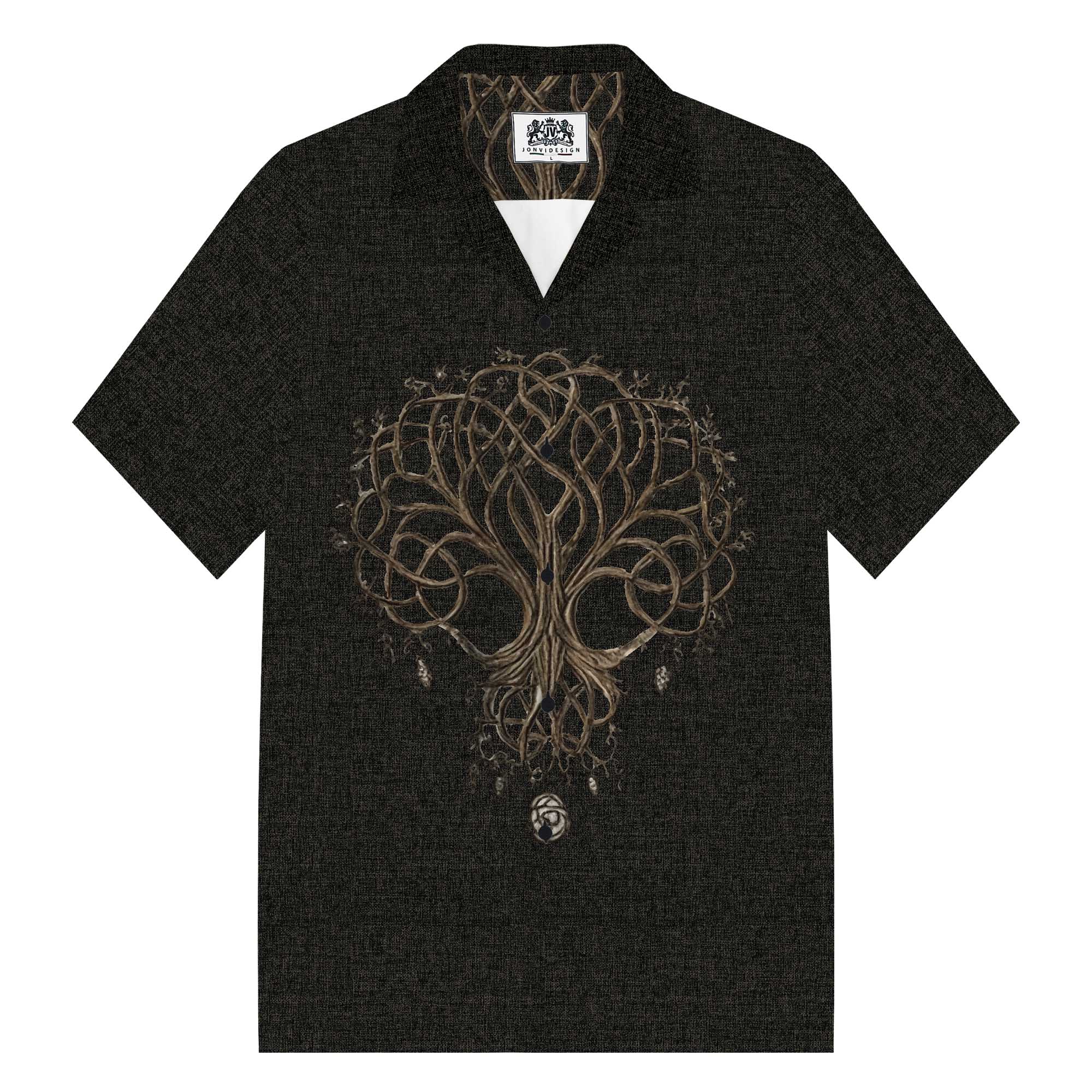 Men's Black Viking Tree of Life Print Camp Collar Casual Short Sleeve Shirt