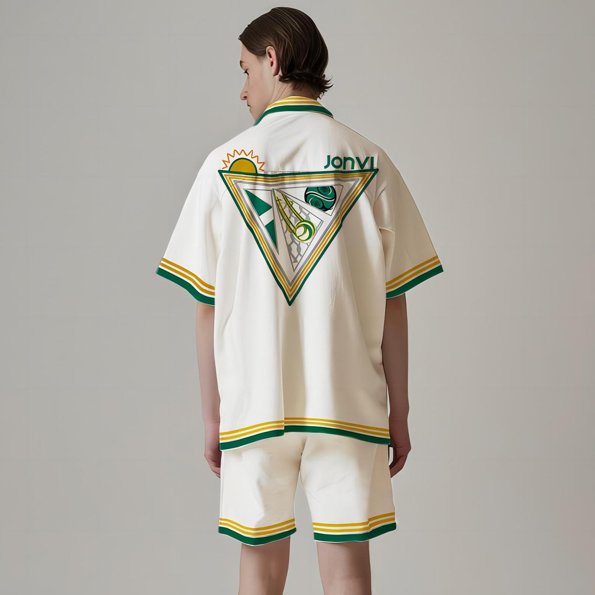 Stripe Pattern Tennis Court Print Short Sleeve Camp Collar Shirt